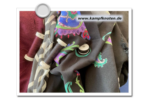 von links nach rechts: ein Loch in der Schulternaht des roten Pullis, ein Loch in der Kleidernaht, ein Ausschnitt einer Bluse, den ich verkleinern wollte und ein Loch in einer Jogginghose…