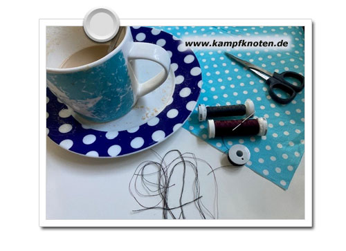 ich richtete mich in meinem Sessel ein. Ein Kaffee.. dazu Gebäck aus dem Urlaub.. (ich liebe diese Kekse zum Kaffee.. man kann sie hineintunken, sie nehmen etwas Kaffee an (zerbröseln nicht umgehend) und ich mag den Geschmack.. Dann noch eine Serienfolge starten und los geht die Klamottenreparatur: