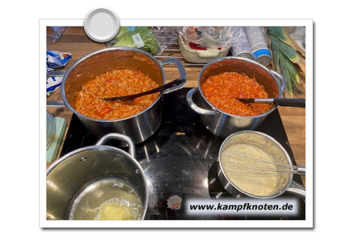 Die Küche glich zwischenzeitlich einem Schlachtfeld und Abwasch gabs auch mehr als gewöhnlich (ungefähr 100% mehr, wegen alles doppelt und weil ich unpedinkt den Schnippelkram vorher erledigt haben wollte und x -Schüsselchen brauchte). Aber ich glaube, das Experiment ist gelungen…