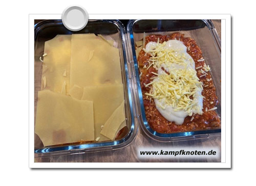 Dann isses ja „nur noch“ die beiden Saucen zusammenköcheln, die Lasagne stapeln und backen. Das geht ja dann wieder nach dem Originalrezept. Insgesamt hab ich 1 grosse Auflaufform für die „Fleischesser“ und 2 kleine für die „Veg/Veggiefraktion gebacken  (was inhaltlich der grossen entspricht, aber man muss es ja noch auseinanderhalten.. vom Aussehen allein geht das mal nicht).