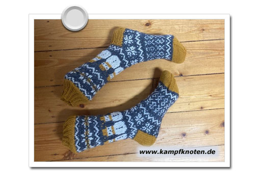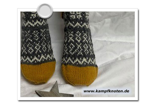 ach süss … da an der Socke ist doch noch ein Musterfehler drin.. seht ihr das da rechts.. ? Naja.. da die Socken bei mir bleiben, nenn ich es Markenzeichen.. (An Pullovern gibt es bei mir IMMER EINEN nicht abgeschnittenen Faden.. und bei Mustersocken wohl immer einen Fehler.. Blöd nur, dass dieser prominent auf der Vorderseite sitzt… ).