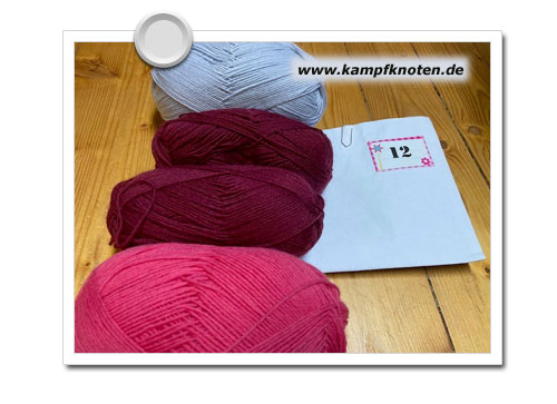Boah.. hier hab ich mich wirklich etwas (?) blöde angestellt. Zunächst musste ich die oberste Farbe austauschen. Statt grau, sah sie hellblau aus (das gefiel mir nicht), also stibitzte ich aus einer anderen 12f25 Tüte ein passendes grau.. Dann fiel mir auf, dass ich noch weiss brauche und stibitzte auch dieses aus einen anderen 12f25-Tüte… Aber jetzt läuft es, wenn man den Zeit findet sich mit 4 Farben gleichzeitig beim stricken nicht zu verknoten…