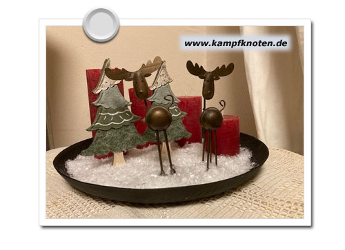 Ich weiss nicht.. fürs Entrümpeln geht die Rechnung nicht ganz auf.. Entrümpelt ist jetzt ein Tütchen Kunstschnee.. neu eingezogen dafür eine grosse Schale und 2 Filztannen (ja.. in Theorie hätte ich die selbst machen können aber in Ermangelung von grünem Filz und Zeit.. ). Ein Teil raus und 3 rein  (die Kerzen zähl ich mal nicht, obwohl eine davon auch noch auf die richtige Grösse geschnitten werden musste) scheint mir keine Gute Bilanz.. aber nu.. (und ja.. Elche sind was gross, aber die kleinen sind weiss und die sieht man auf dem Kunstschnee einfach gar nicht.. )