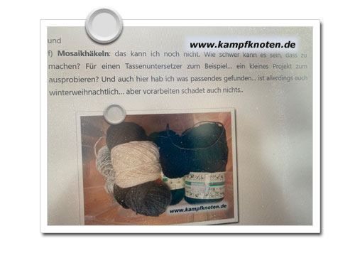 Mosaikhäkeln.. Das hab ich immer noch nicht probiert.. aber wann ich das endlich mal probiere, weiss ich auch noch nicht.. Immerhin hab ich es mir Ende 2022 für 2023 vorgenommen.. Naja… Ich glaube, ich habe kürzlich erst die Wolle auf dem Foto auf der Suche nach was anderem wieder in den Stash sortiert oder ist das der Karton der ensorgt wurde.. naja..wer weiss? Ich überblicke das Chaos nicht mehr. Vielleicht komm ich ja dieses Jahr noch zum ausprobieren.. (immerhin gibts da noch ein offenes Bingofeld.. als ob das klappen würde)