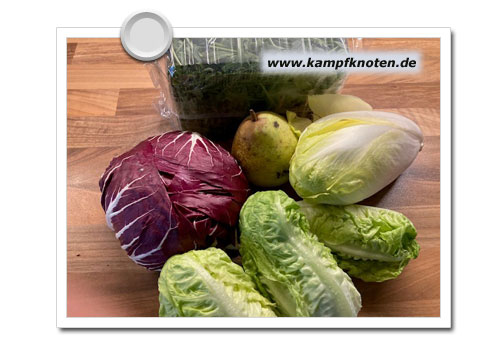 Ich sags mal so.. auf die Zutaten (Rucola, Birne, Romanasalat, Chicoree und Radicchio) oben hatte ich gestern Appetit.. und daraus wird heute ein Salatteller, zu dem noch gebratene Maultaschen gehören.. Und in dieser Mischung schmeckt sogar der bittere Chicoree (ich werd auch nicht übertreiben damit.) Eigentlich gehören in das Rezept noch Rote Beete.. aber die haben mir noch nie geschmeckt in egal welcher Konstellation oder Zubereitung… .