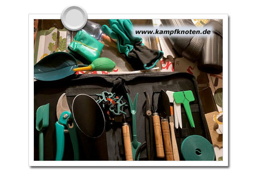 ich schätze, ich werde mir noch selbst eine Aufbewahrung nähen.. Ich finde das mitgelieferte Mäppchen viel zu klein. Aber es sind coole Sachen drin. Im Hochbeet werden die sicher gute Dienste leisten.. Auf die Knieschoner (rechts unterm Schriftzug) bin ich auch gespannt… Wirkt auch alles stabil so auf den ersten Blick. Ich überlege grad noch wo der Bewässerungsvogel wohnen darf.. Vielleicht im Hibiskus am Küchenfenster?