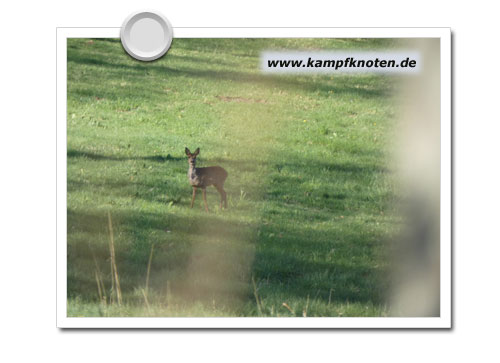 ich habs nicht so gut erklärt. Auf dem ersten Bild sieht man den Zaun vor dem ich sass und auf dem 2ten Bild das von weit weg herangezoomte Rehlein….
